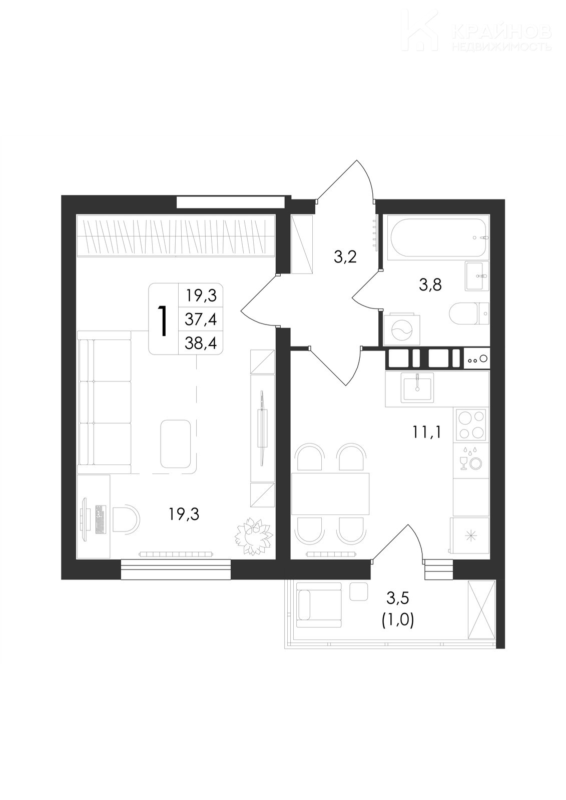 Площадь: 38.40м2