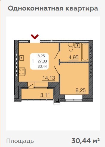 Общая с учётом балкона 30,44 кв.м Общая без балкона 27,33 кв.м