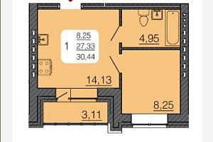 Комната 8,25 кв.м Кухня-гостинная 14,13 кв.м Санузел 4,95 кв.м Лоджия 3,11