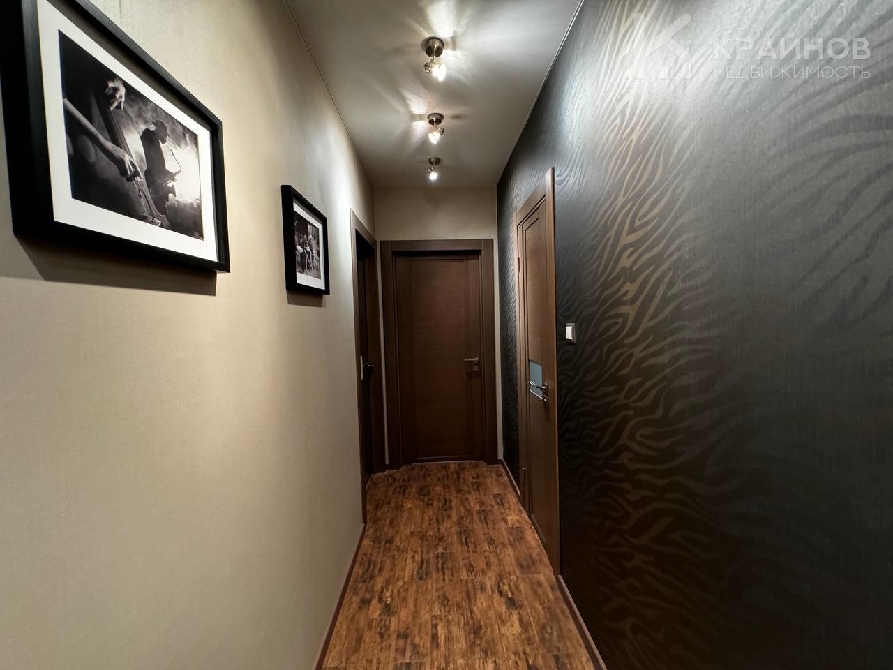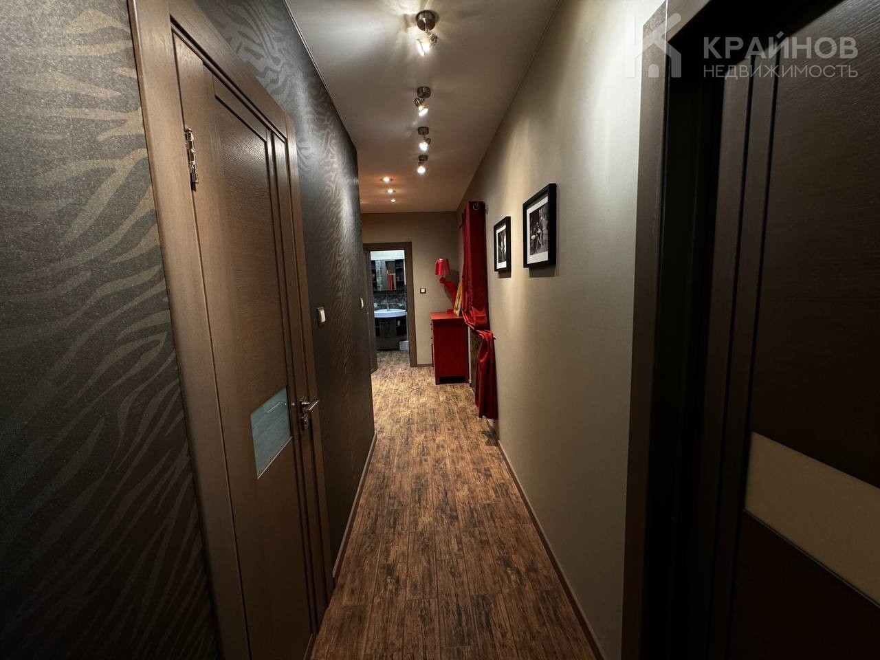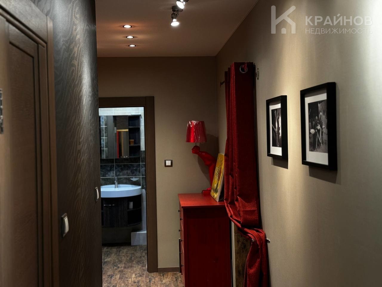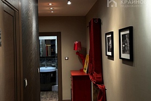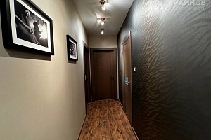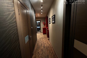 Просторный коридор с гардеробной зоной связывают между собой две спальни и два раздельных сан-узла .