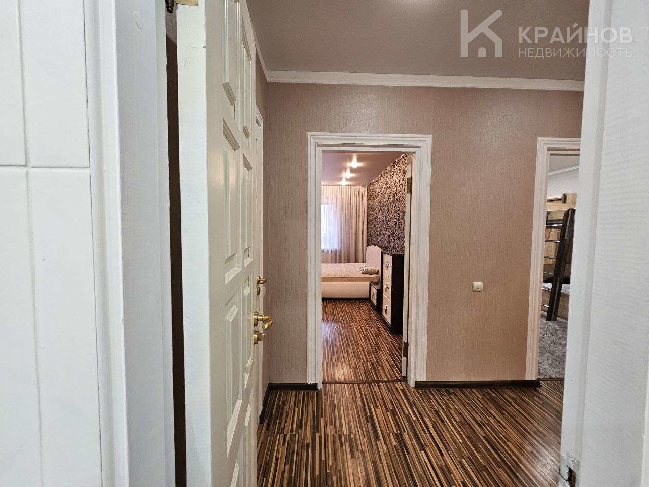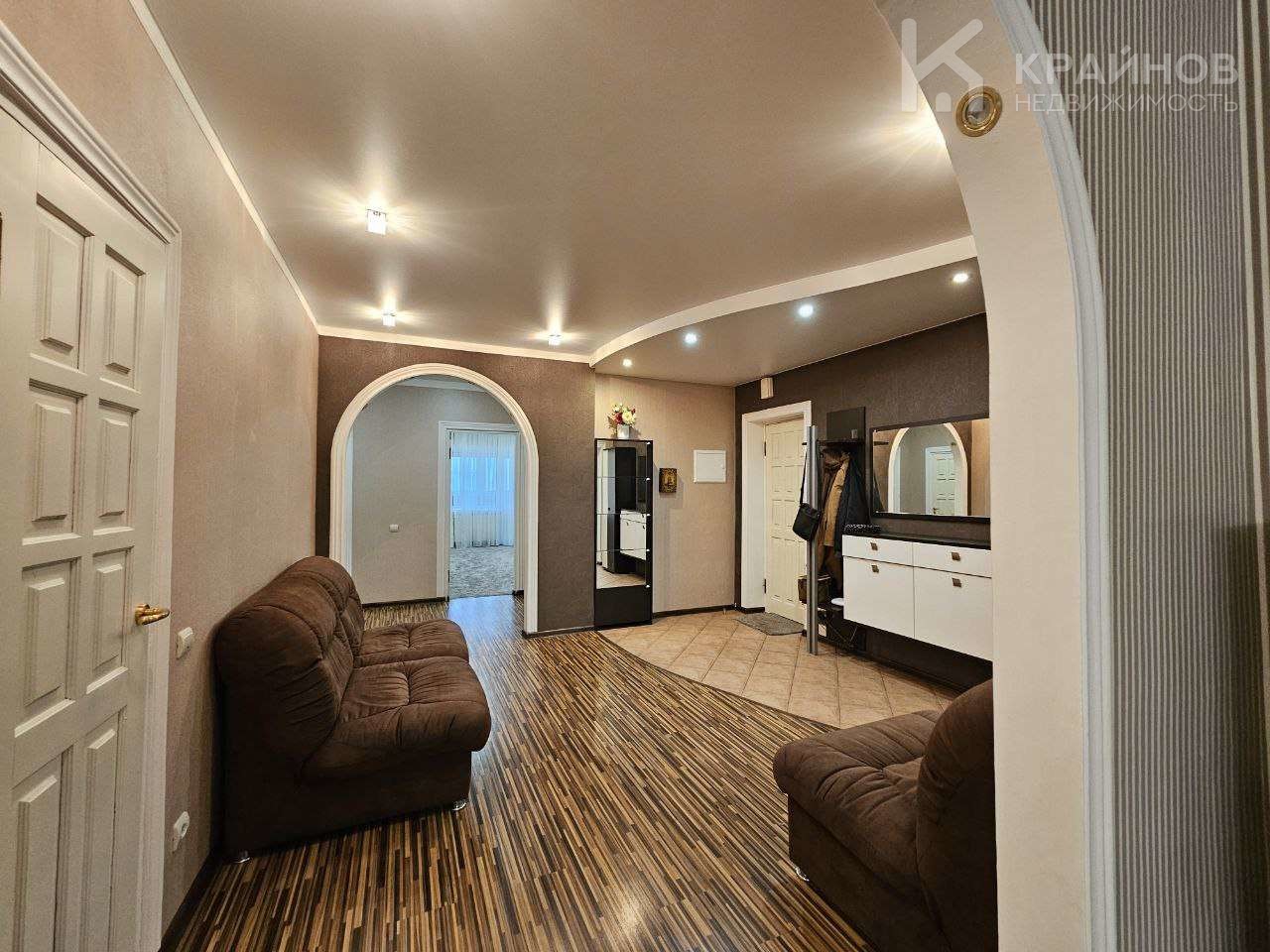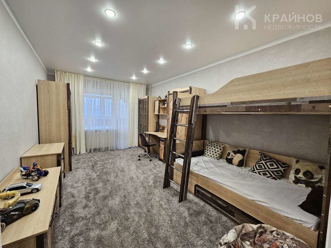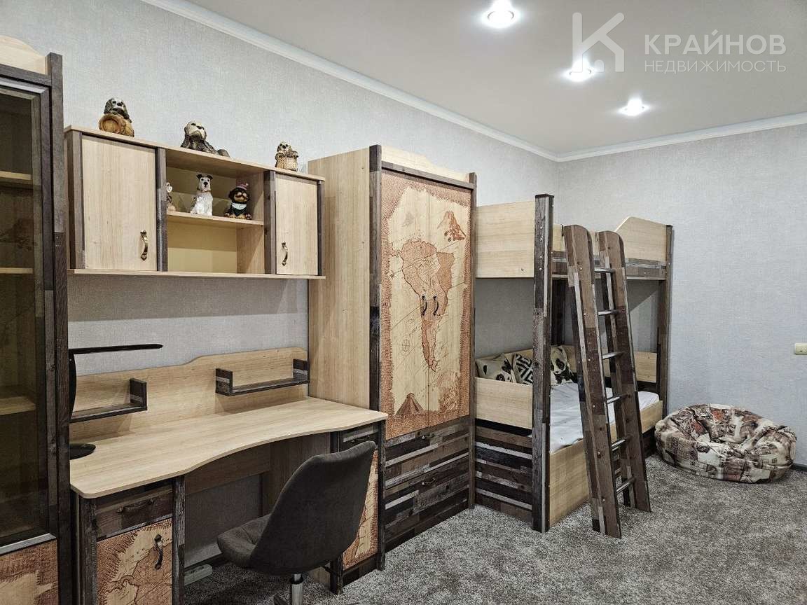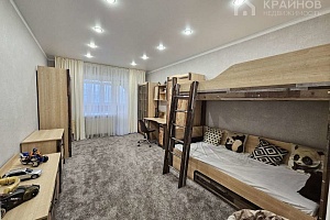 На полу ламинат, частично плитка на кухне и входной группой. Натяжные потолки, в детской постелен новый ковролин. В зале поклеены дорогие обои. На кухне мягкие декоративные обои, под покраску. Установлены межкомнатные деревянные двери. На кухне хорошая техника – Ariston, Whirlpool. Сантехника в хорошем состоянии.