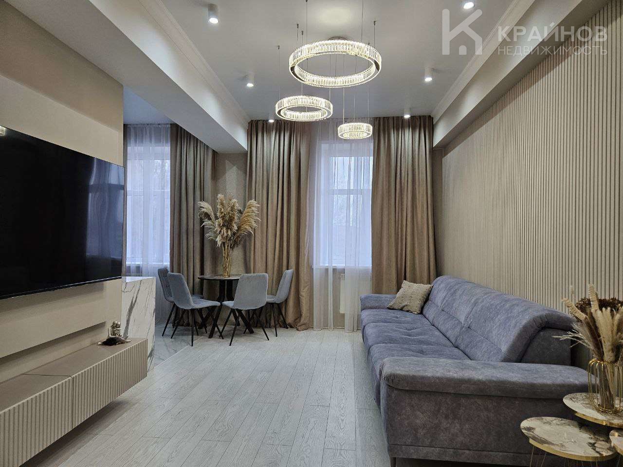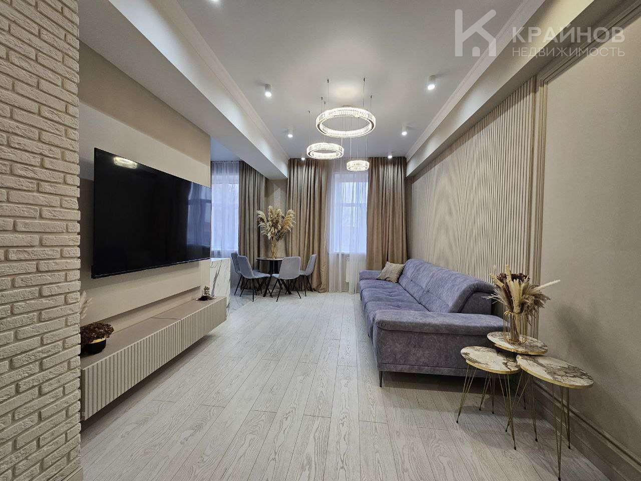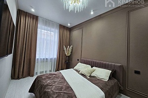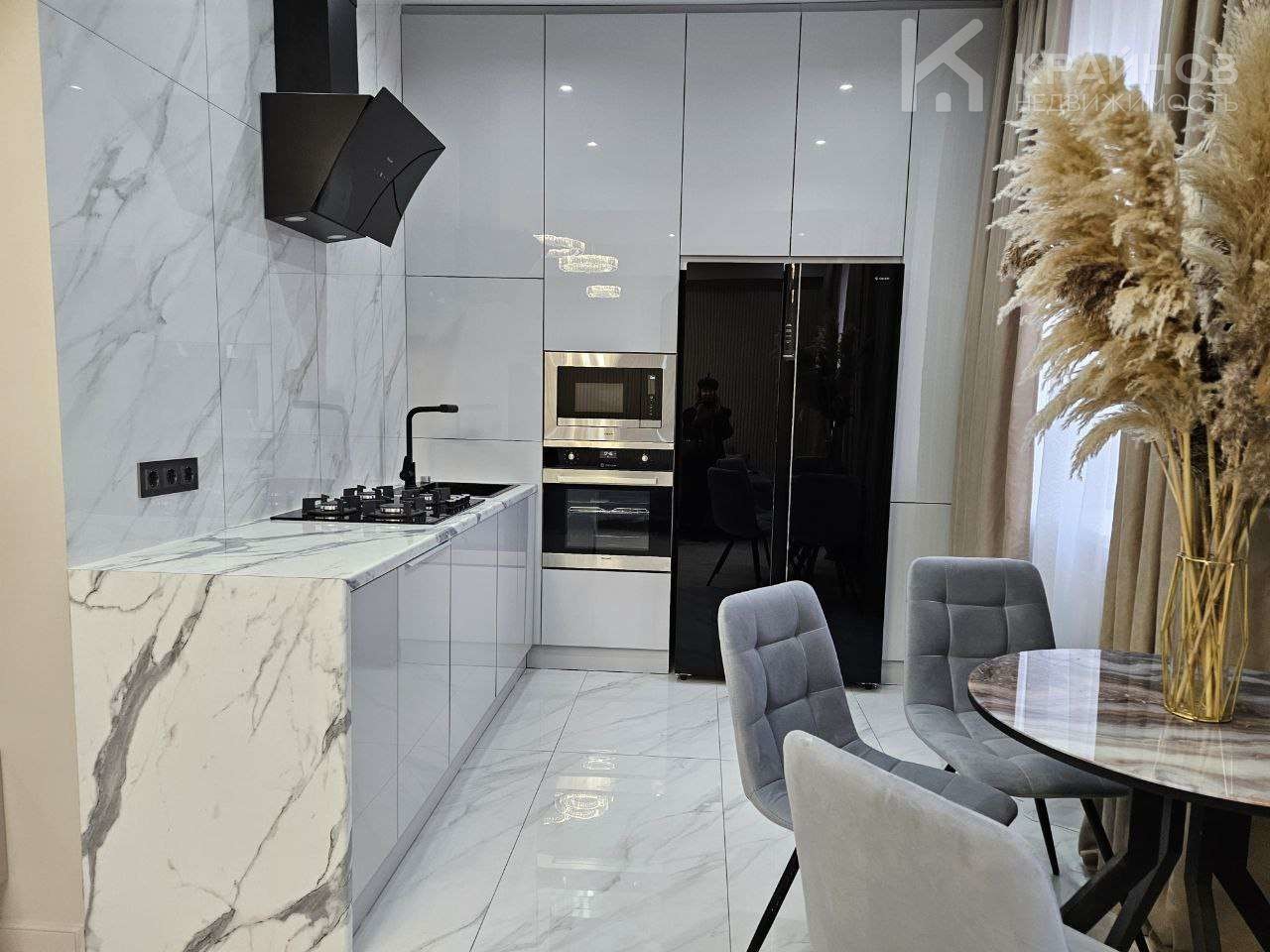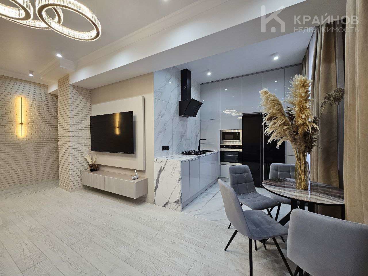 Квартира с Дизайнерским, современным ремонтом. Полностью укомплектована для жизни. Большие шкафы до потолка, стильная спальня. Кухня укомплектована мебелью и техникой. Есть посудомоечная машина, духовой шкаф, микроволновая печь, большой холодильник. Установлена новая колонка. Установлены телевизоры в каждой комнате. В гостиной установлен большой телевизор и стильный, дорогой, современный диван.