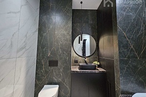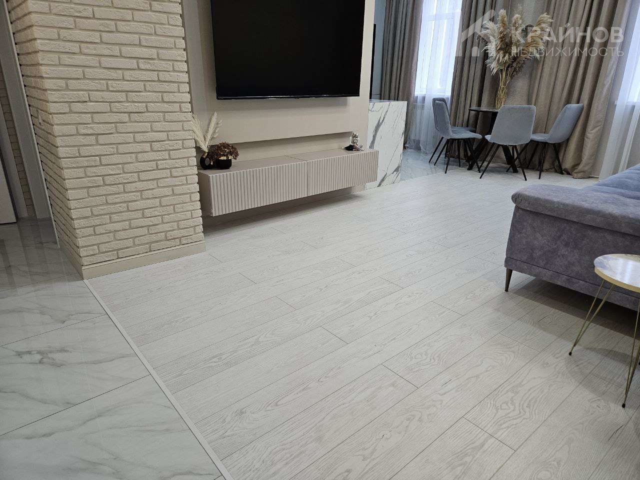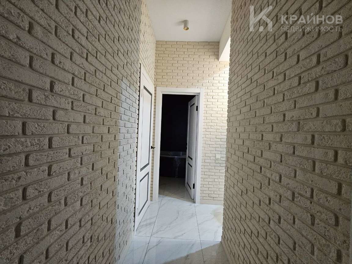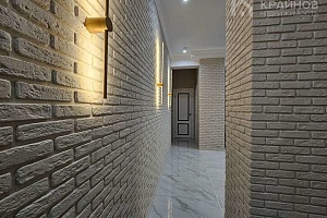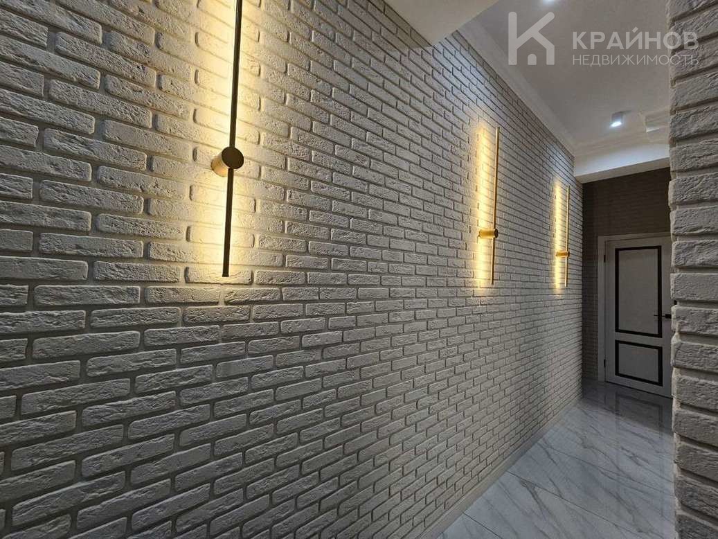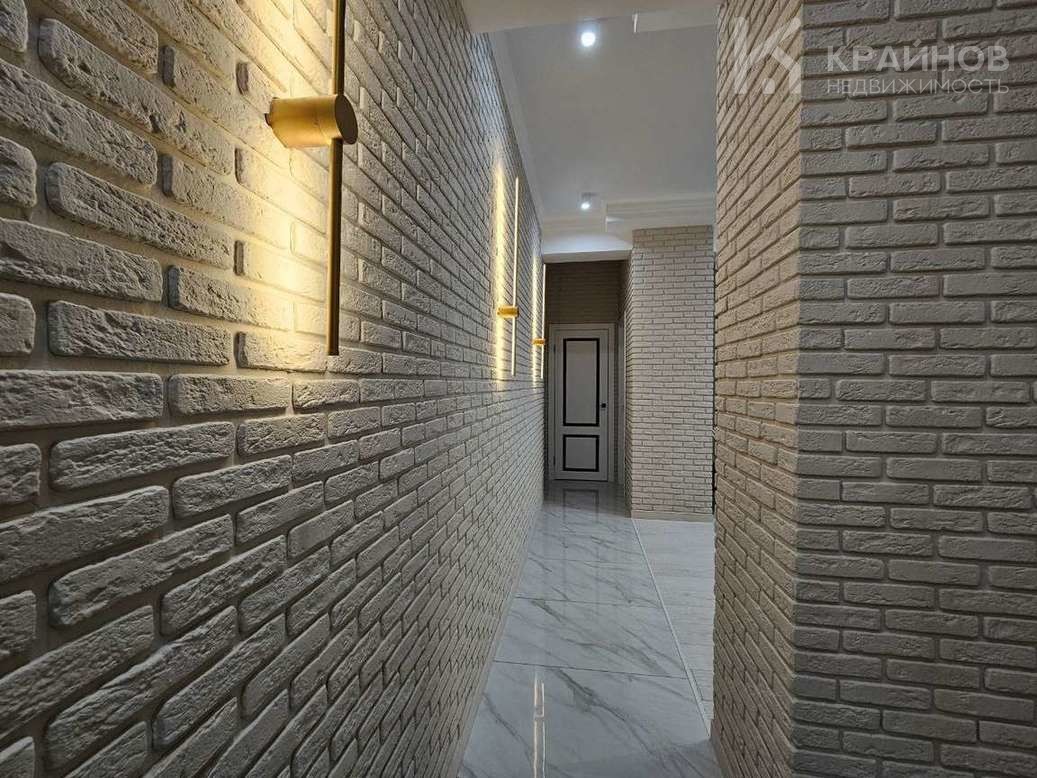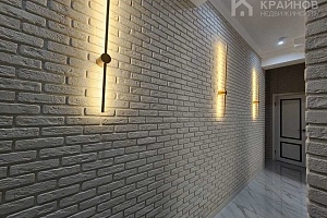 Стены покрашены, с современными вставками, много дополнительного света, красивые дизайнерские люстры, точечные светильники, подсветка. На полу современный кафель, ламинат в комнатах.