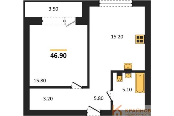 1-комн. квартира, 46.90 м², 3 этаж