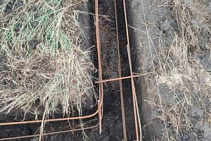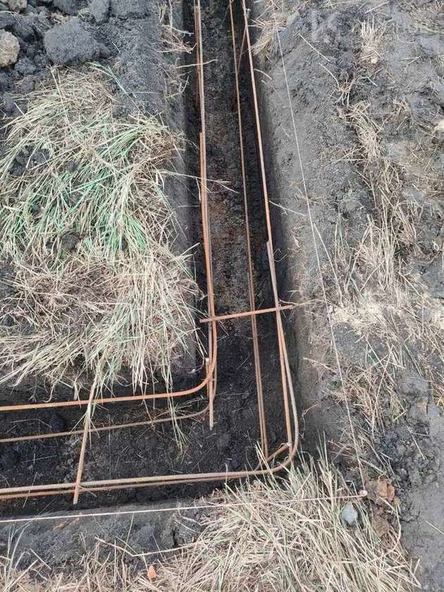 Фундамент ленточный, монолитный (бетон 300) 1,1 м. Армопояс 4 кирпича.