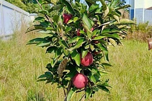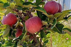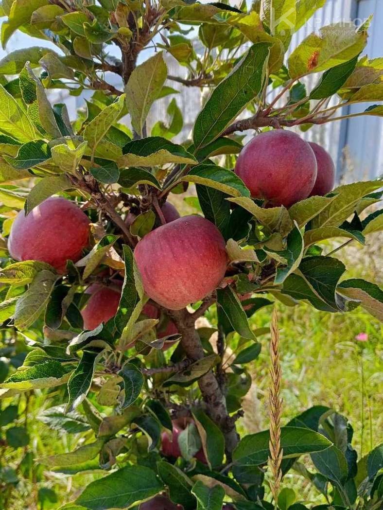 Треугольная форма. По фасаду 45 метров. Сортовые малина и клубника. Много цветов. Деревья начинают плодоносить.