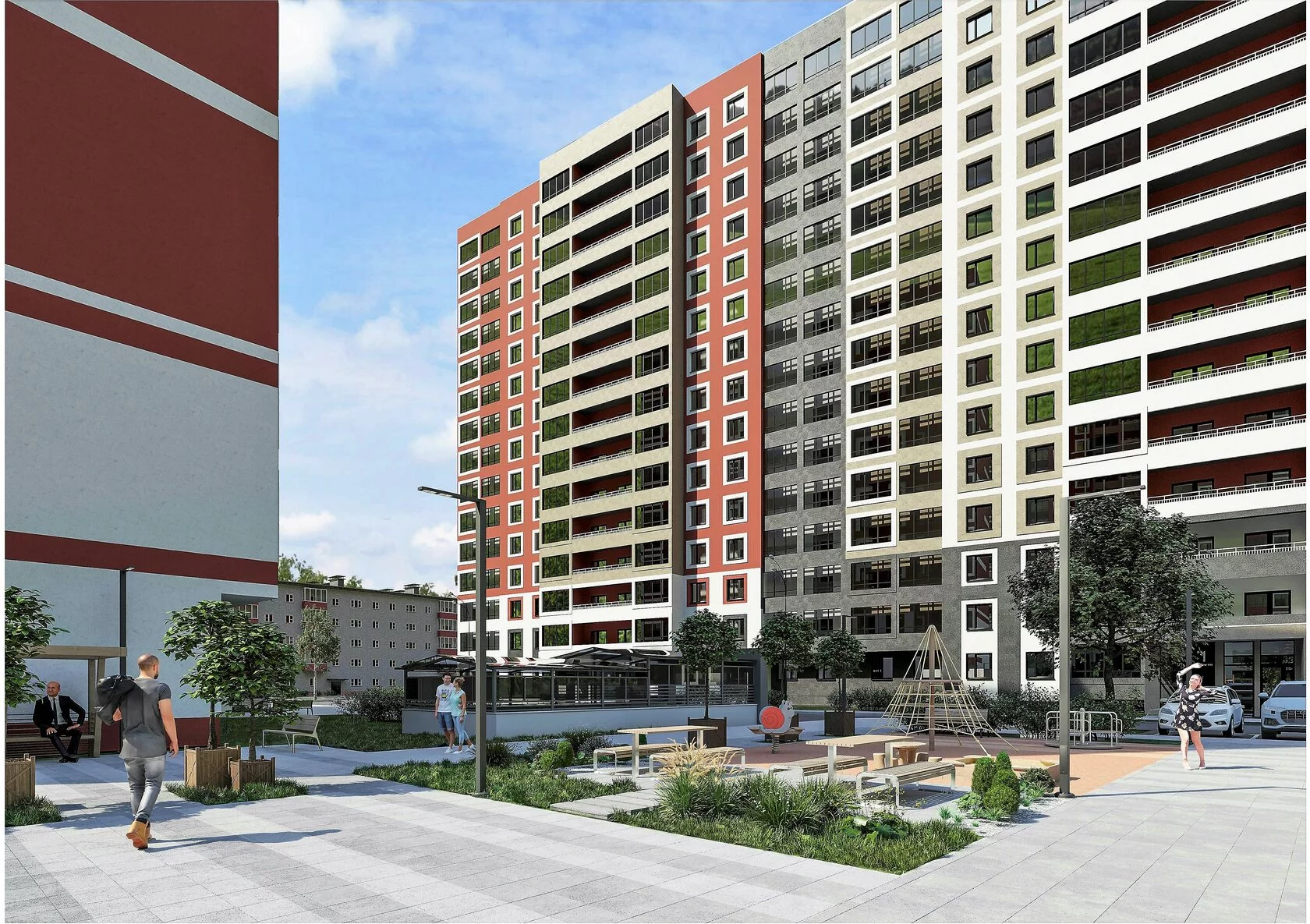 Во дворе жилого комплекса предусмотрены детские площадки с современным игровым оборудованием и безопасным покрытием. Продуманный проект делит дворовое пространство на зоны для разных возрастов, что делает времяпрепровождение интересным как для детей, так и для взрослых. Также будет организован большой наземный паркинг для удобства жильцов.