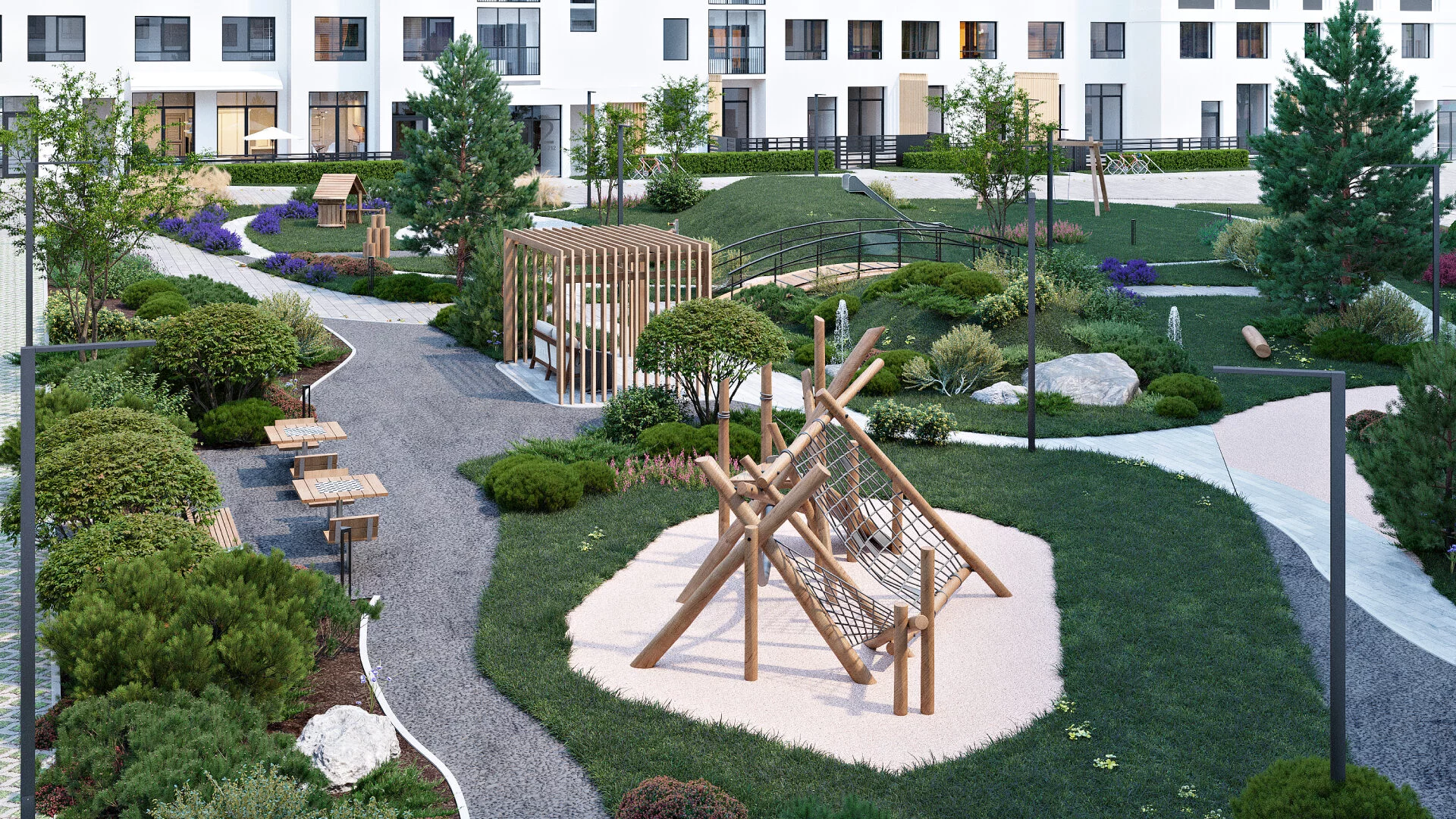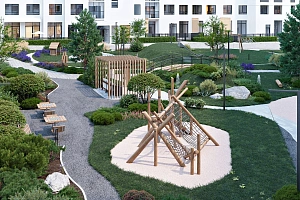 Дворовая территория комплекса — это настоящая оаза с множеством цветов, растений, кустарников и деревьев. Мы создали дружелюбный двор без машин, идеально подходящий для отдыха и игр. Ландшафтное экооборудование из твердых пород дерева способствует развитию фантазии у детей и создает разнообразные сценарии для их игр.
