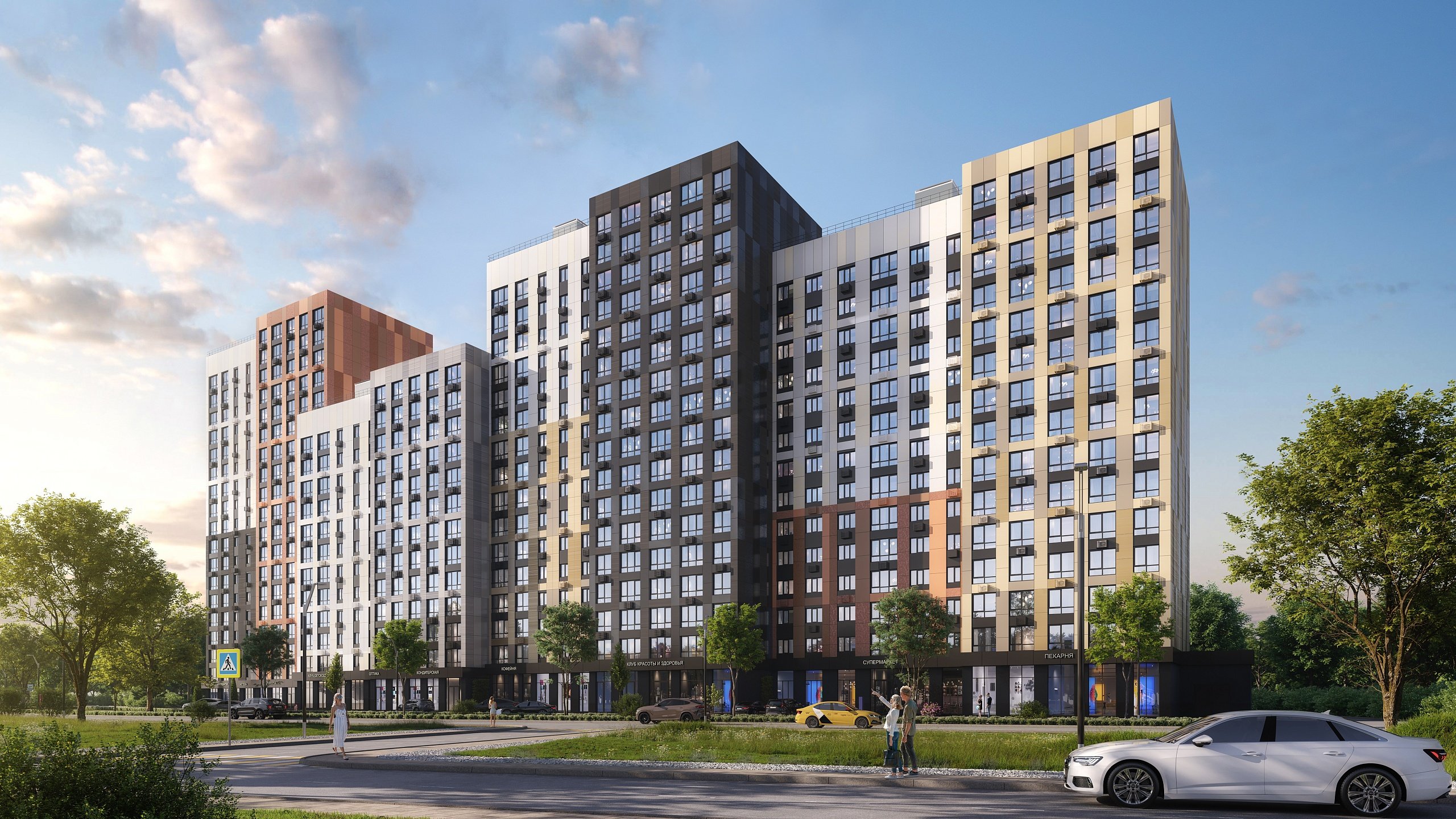 На первом этаже комплекса предусмотрены коммерческие площади для продуктового супермаркета, аптек, пекарен и салонов красоты, что обеспечивает комфортную жизнь жителям.