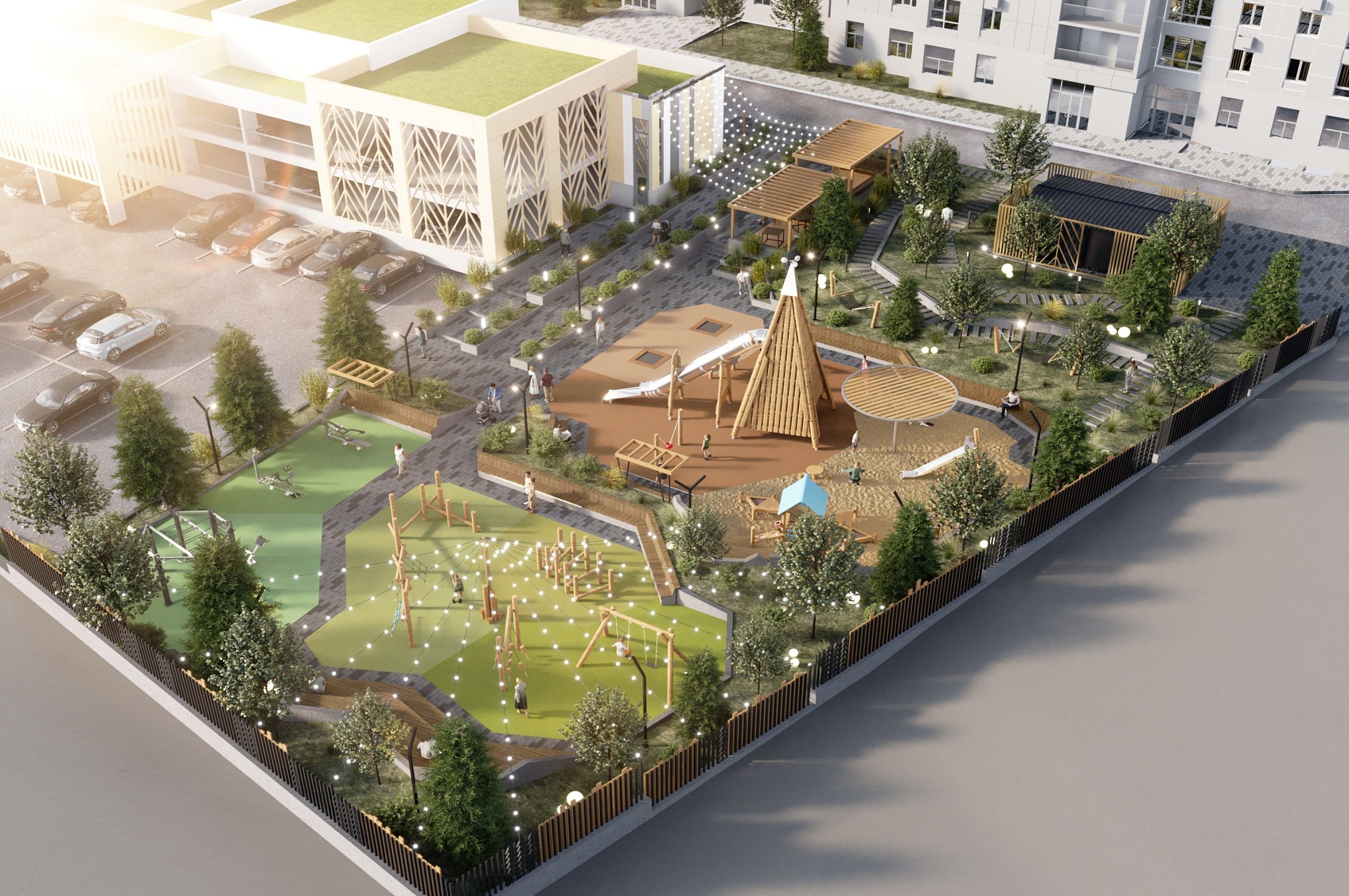 • Зоны отдыха с беседками и перголами