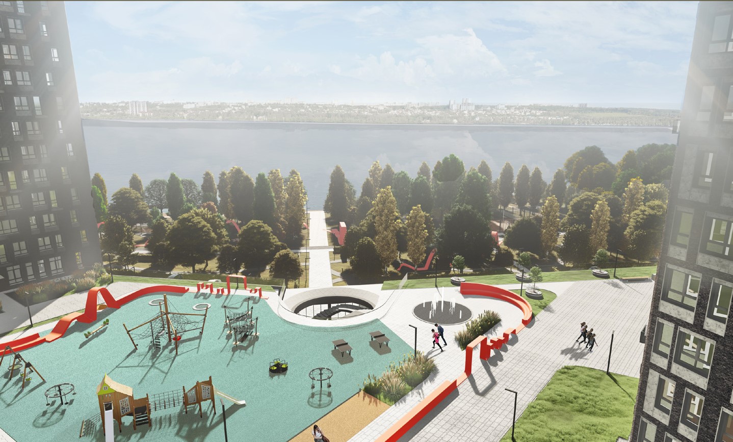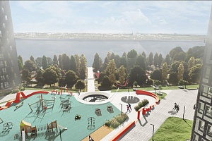 • Просторный двор на стилобате с великолепными видами на водохранилище и Северный мост.