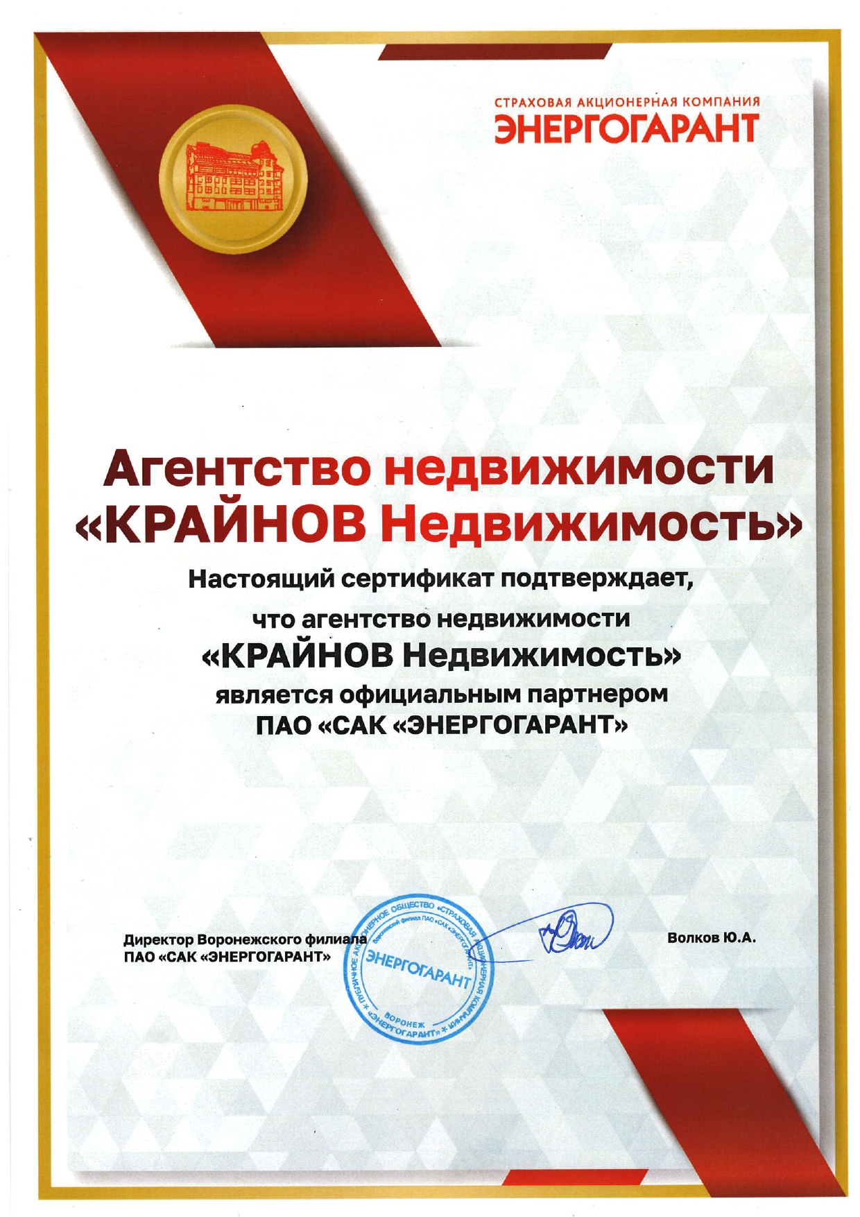 Настоящий сертификат подтверждает, что наша компания является официальным партнером ПАО САК ЭНЕРГОГАРАНТ