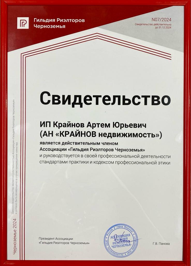 Свидетельство удостоверяет, что наша компания является действительным членом Ассоциации Гильдии Риэлторов Черноземья