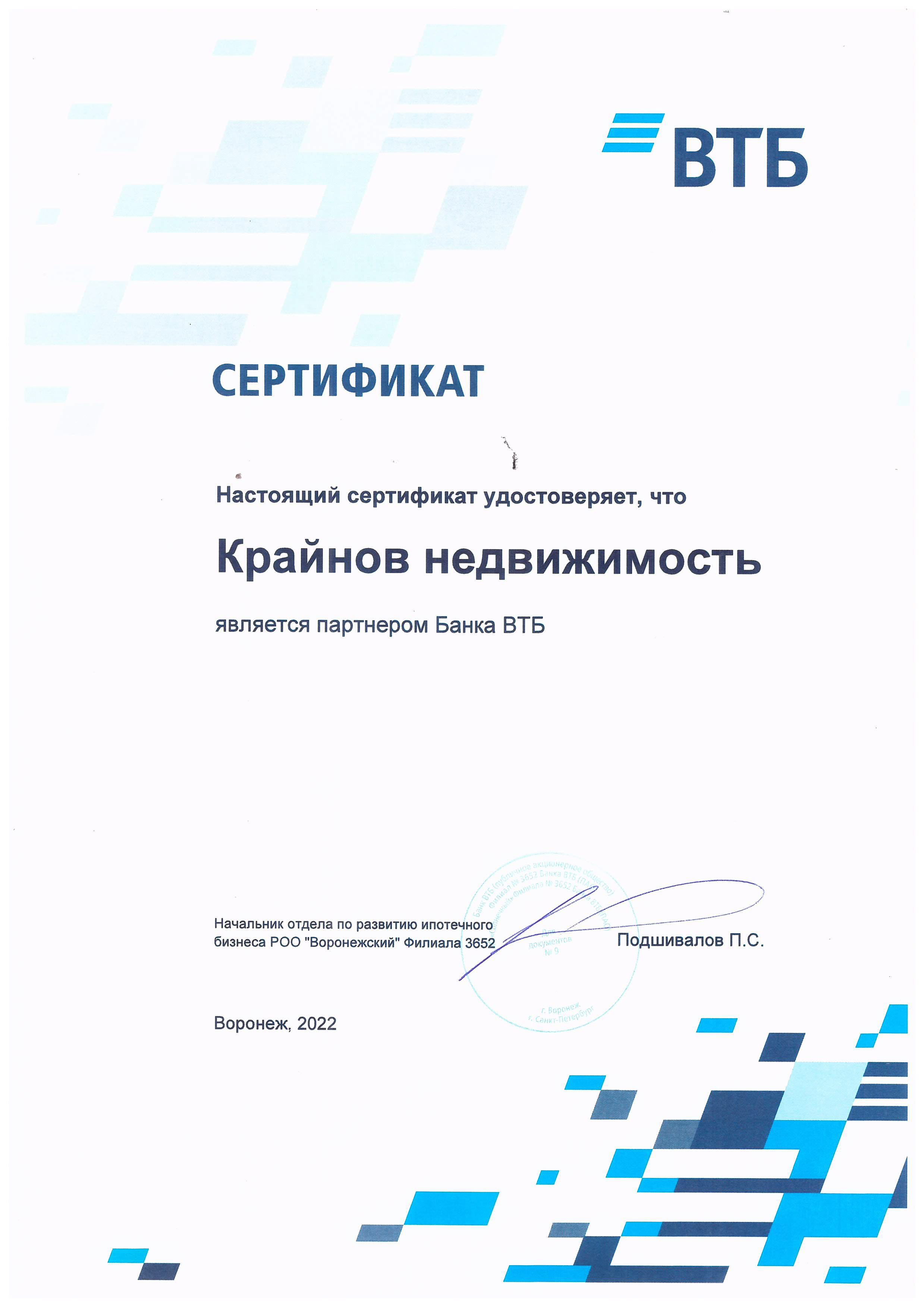 Настоящий сертификат удостоверяет, что мы являемся официальным партнером ПАО Банк ВТБ